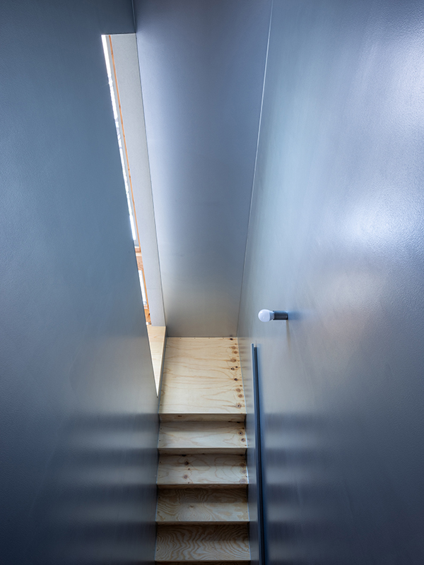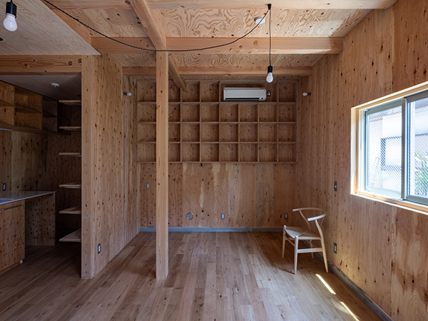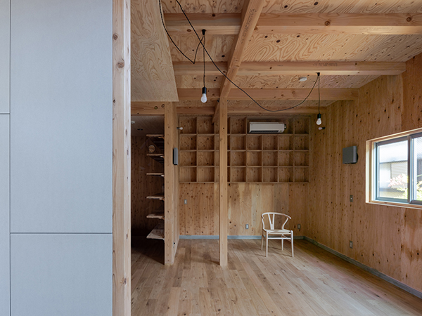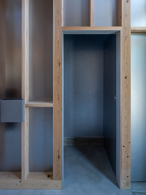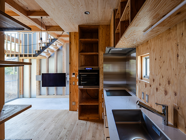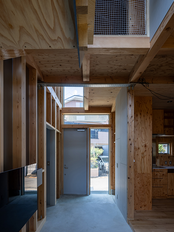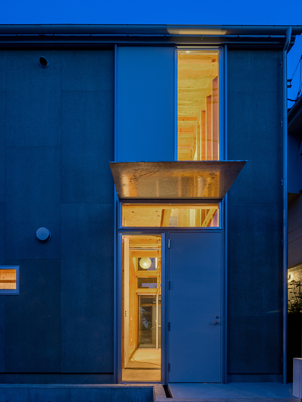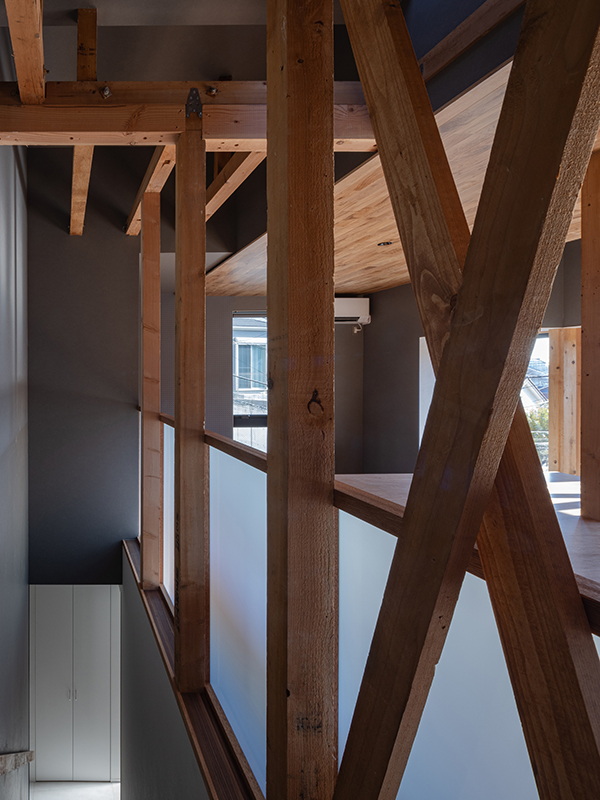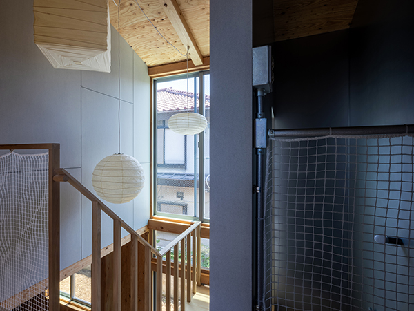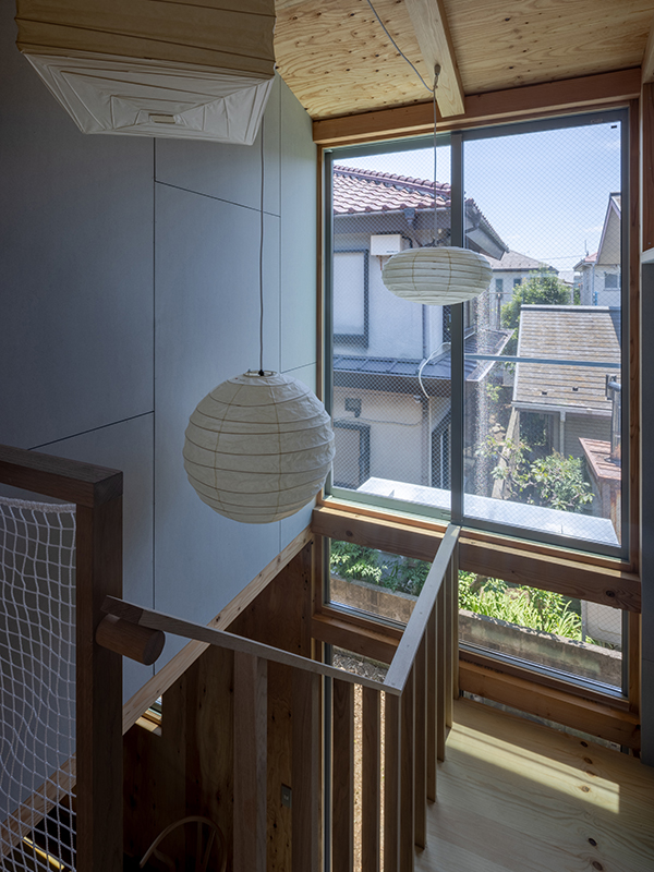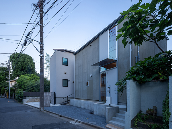 山の手の住宅地に立つ戸建て住宅。分筆によって細分化された土地でも住環境が窮屈にならないよう、周辺環境を頼りに抜けを感じられる構成とし、面積以上の広がりを感じられる空間を実現している。